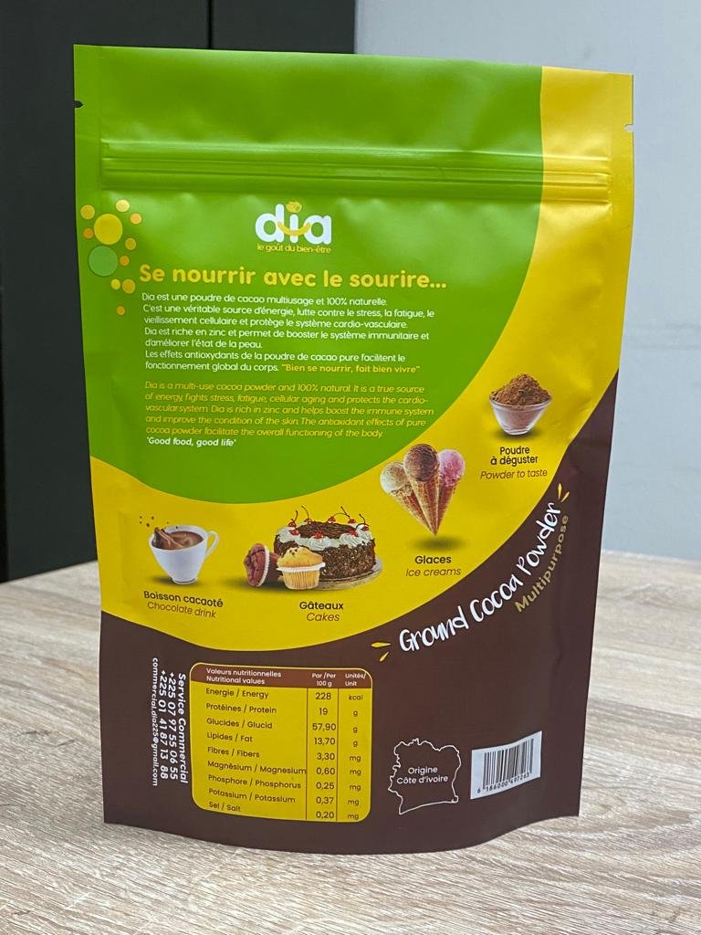 DIA est une poudre de cacao naturelle multiusage fabriquée en Côte d’Ivoire.